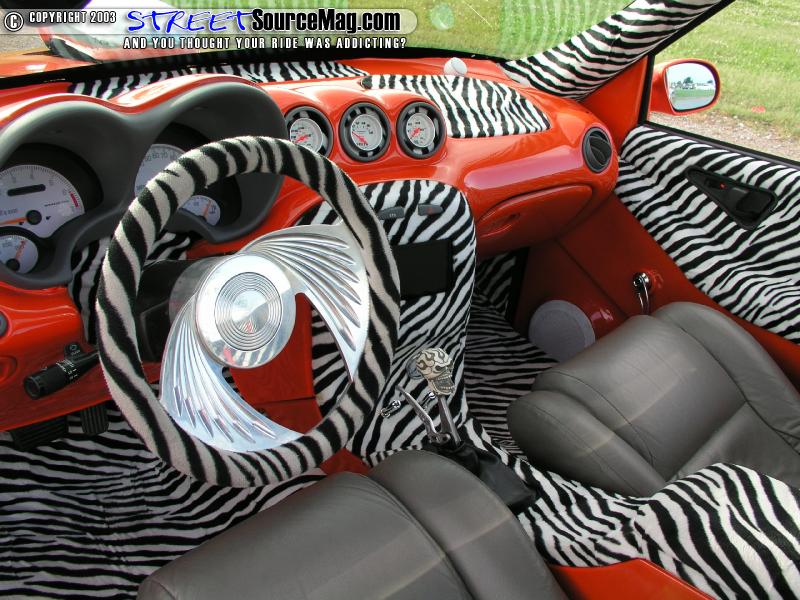 and other items were treated with more Zebra print then the local zoo could provide. Ok so no zebra's were actually killed to supply the material so we lied. For seating arrangements Dustin had a seat of Fiero buckets cut down and rewrapped in Grey Italian Leather. Ok so maybe it wasn't Italian leather but it looks good though.