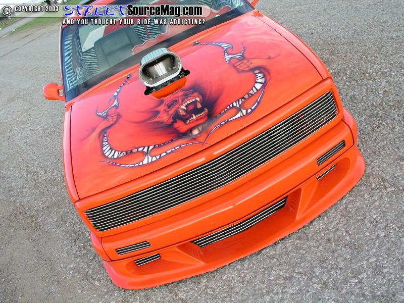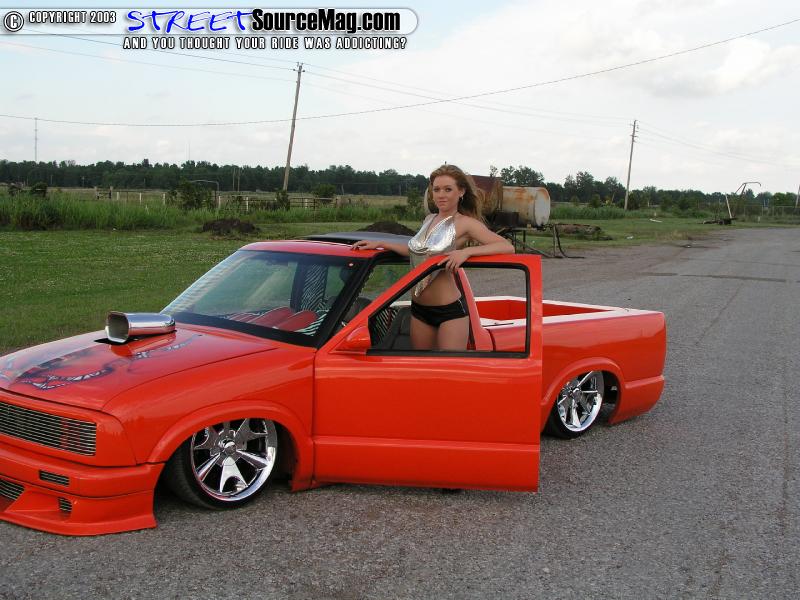 Now that Dustin had everything meticulously back into place it was time for some Bling-Bling, so Dustin decided on 18" Y2K Edge chrome rollers wrapped in 215/30/18 Nitto skins. So what's next I mean the truck has one helluva built motor, it now sports a body dragging stance and to boot it's got more Zebra print then the local zoo, Cause he killed em' all to build his truck, OK OK I'm just kidding about the dead zebra's. Well show it DUH!!!!!! Dustin is not scared to take his truck anywhere at anytime. I've personally seen this truck at shows all over and after giving me the run around for a YEAR Dustin finally gave me the privilege of shooting it for SSM at Greenville this year. The LOVELY C.J. is once again our model of choice.