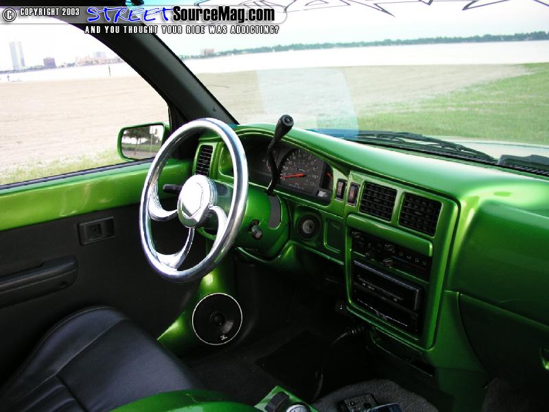 A custom center console was then built to house the air ride control items of the taco. A custom built enclosure was fiberglassed to house Kicker Comp 10's and a Kicker 700.5 amp. A Pioneer AVX-P 7300 was the headunit of choice along with an indash DVD player.   The headliner was then wrapped in gray leather and custom one off Billet accents were custom made to adorn the headliner. To finish off the interior a Colorado Customs Whiskey steering wheel was added to match the wheels that were on the truck.