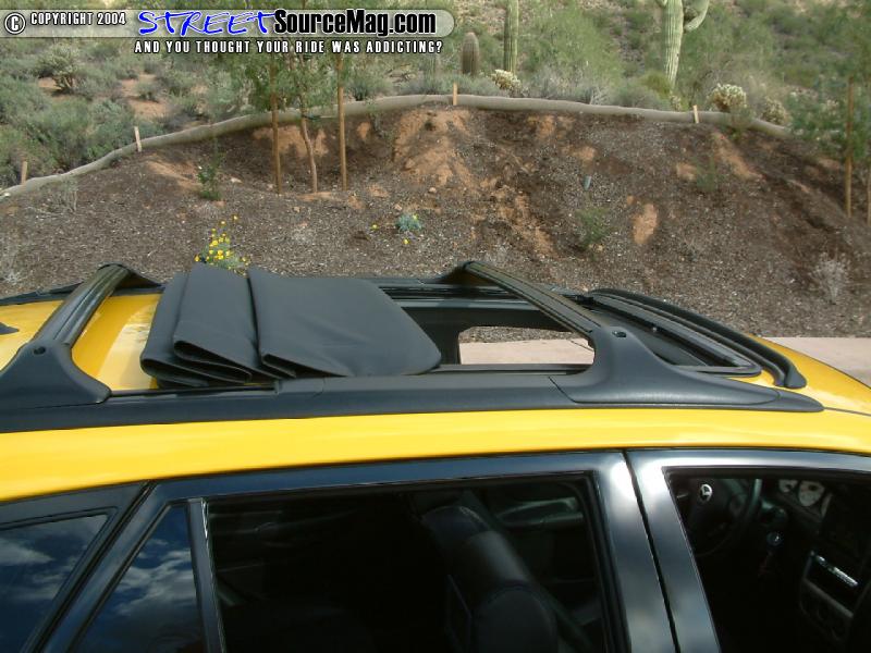 When working over the exterior Rob would keep things simple and clean. Starting upfront Rob would install a Precision Grille along with some Matrix Racing taillights out back. Being in the sun state Rob would then install a sliding ragtop. The underneath side of the hood would then be Rhino lined yellow to match the Vivid yellow paint sprayed by J-Rock of Peoria, AZ.