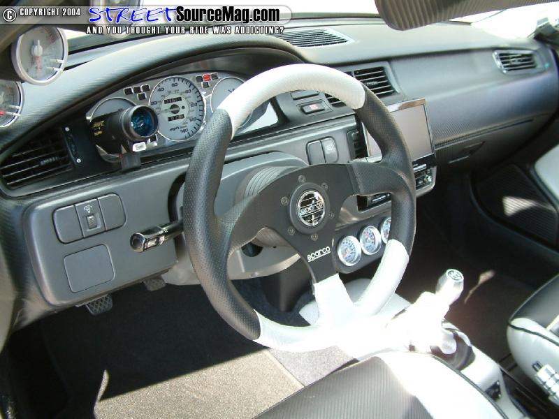 Greddy, reverse indiglo gauges would replace the stock gauges while a set of Integra GSR seats stitched with flames would replace the stock seats.   A Sparco steering wheel and Trenz flamed billet mirror would help the accessories while a chrome roll cage and Sparco 4 point harness are installed for safety. The center console would then be housed with a custom gauge pod housing Greddy gauges.