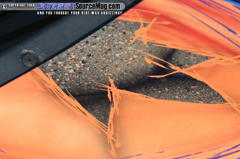 Inside the car Jose fabricated new seat rails and installed a set of Toyota Celica seats in the front. In the rear of the car Jose fit the rear seats of a Toyota Celica as well. The seats were all wrapped in leather. The inside of the car mirrors the exterior of the car with more graphics. Jose then installed a Jensen CD player.