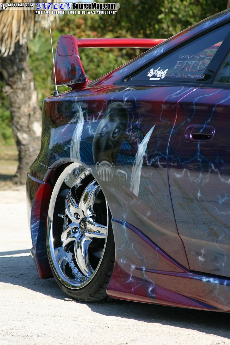 Inside the car sits a set of racing seats and a couple other custom dress ups. Almost every aspect of the interior was painted or smoothed from the headliner to the dashboard, and door panels.
