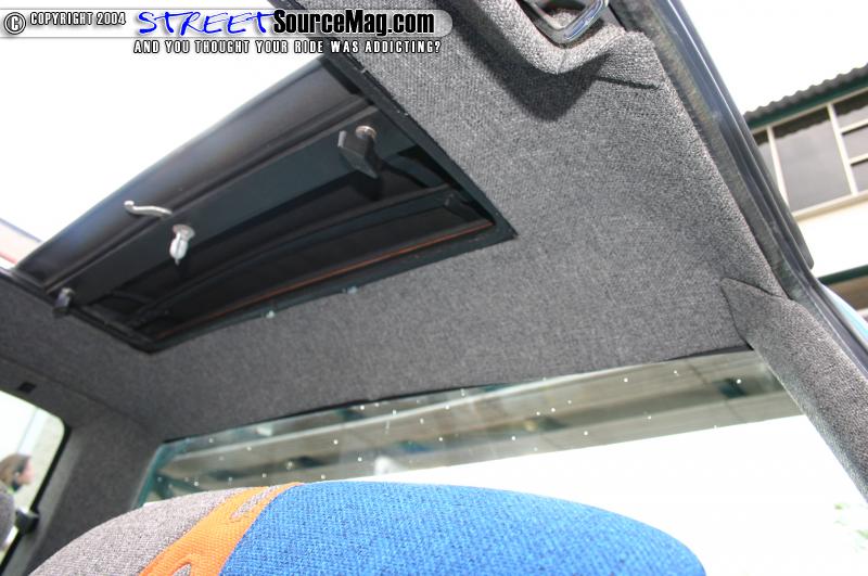 The headliner was wrapped in tweed and the seats were wrapped in blue tweed and grey and orange graphics to match the exterior paint job by Strader’s Upholstery of Milford, DE. Joe’s Car Stereo wired up the Alpine CD player, MS Quart interior speakers, and Kicker Solo baric subs.