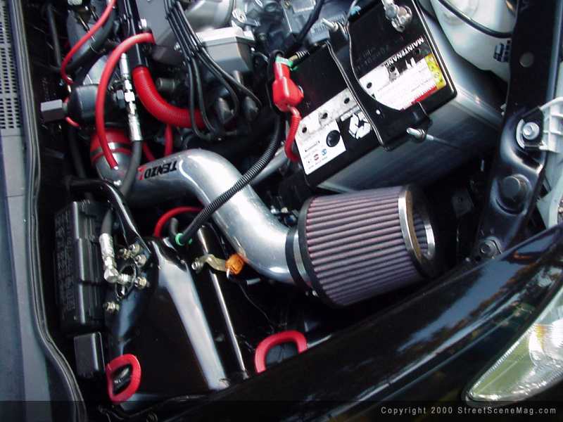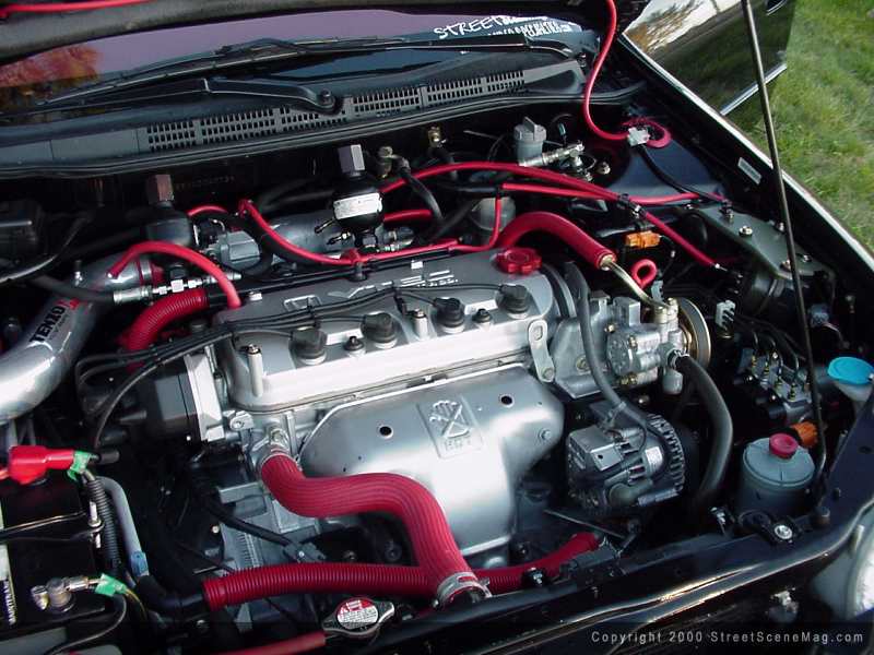 To roll the dubs around town along with all of that stereo equipment comes the stock 2.3L VTEC 4 cylinder. To help provide a little pick up, Tony added a Tenzo R intake along with adding a chrome Seabring muffler. To help with the looks of the engine Tony installed red sleeves over hoses throughout