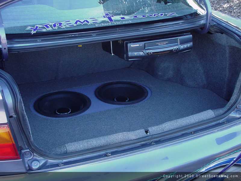 To utilize the monitors, Adam decided to install many components such as a Sony Playstation and a Panasonic VCR. To help provide the sound would be an Alpine silver swing CD player. Using 3 Alpine amps to supply power to the Dynoaudio mids and tweets along with a few Polk Audio 12-inch subs. When you glance into the rear of the Civic you can see Street Wires capacitor covered in Plexiglas in the rear armrest. Adam himself wired all of the audio and visual components.