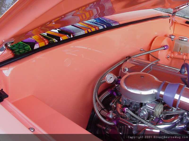 The front would be next on the long list of upgrades. The stock drop spindles would be removed, chromed and reinstalled. The battery would be relocated under the bed for added room under the hood, and Chris would rework the front wheel wells. The added room would work out nicely tucking the 17-inch Centerline wheels, which had been wrapped nicely in 205/40-inch rubber. While tearing into the engine bay, Chris would smooth out all panels including the firewall. Helping to bring things down, a set of home custom built drop a-arms would be installed. With a set of chrome Pro shocks and Firestone airbags in place, the Mazda was now laying flat. The entire air ride system is run with braided Aeroquip airlines along with billet clamps.