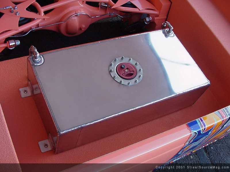 Moving to the bed, Chris would shave the gas filler door and install a custom built 15-gallon aluminum fuel cell by Nathan Kahler. The rear bumper would be ditched and a roll pan would be welded in its place. After already welding the rear, the stock taillights would be removed and the original locations welded shut. Taking their place would be a set of ½"X10" LED's for taillights.