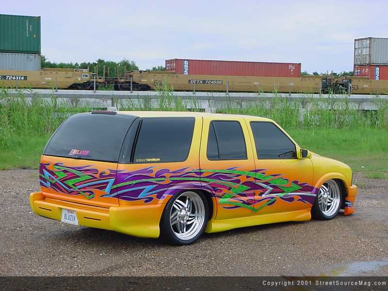 Larry Brown of Spring TX bought this Jimmy from Pat Maxwell in Sept. of 2000 about 70 percent finished. Anything and everything that could be unbolted was off and laying in the shop. It was painted the first color of the tri-coat and the main graphics were down the side. What Larry really got was a painted shell of a truck. Larry also got a bunch of boxes full of nuts, bolts, hinges, switches and glass pieces. The Jimmy had sat in the shop with no glass in it and was covered in over spray. The under carriage was thrashed. The interior had been ruined when the doorjambs were sanded to remove the graphics from the previous paint job. The front fender had a big dent where a masking machine had fallen on it. The windshield was cracked. The rear bumper was raw steel. The side aero skirts were missing. And on and on...