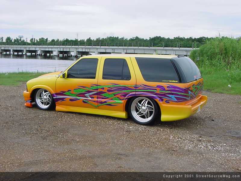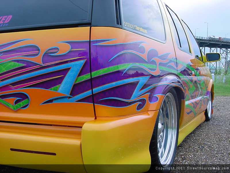 Every single inch of the truck was masked, prepped and sprayed by him in an open shop at night. Pat came to the new shop and sprayed the fade and then Larry sprayed the first coat of clear. The SUV was disassembled and cleared in sections. Larry sprayed it all in House of Kolor clear. After the clear was sprayed, he then sanded it with 500 grit and a DA till it was flat. Pat came over again during the next 3 weeks and striped it. He showed Larry some tricks and let him stripe the jambs and doorposts.