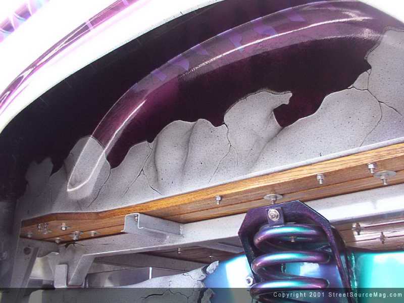 Now that we are inside the bed of this Ford, the floor has been swapped for a wood panel floor and stained to perfection and a 3" triple roll bar was bolted in and painted Chromalusion to match the body of the truck. Johnny did all of the work to complete the body of this truck with the help of his friend Mike Boyce.