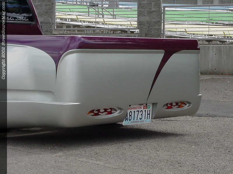 Next the black step pads on the step side would be shaved front and rear of the steps.   Paying attention to detail, the bodylines under the rear window would then be shaved, and to finish things off Eric had a hand built roll pan molded in underneath the shaved tailgate. Tom Jacobs is responsible for the body modifications.