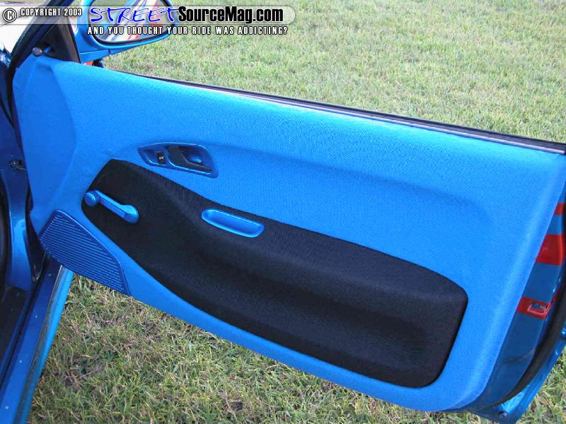 Quickly shifting from one step to the next Shanon moved on to the interior of the vehicle. He had the dashboard and various interior panels fiberglass and painted again with help of Chad Boudreaux and then turned to Deville's Seat Cover shop to have the door panels, headliner and the R1 Racing Seats wrapped in blue and black tweed.