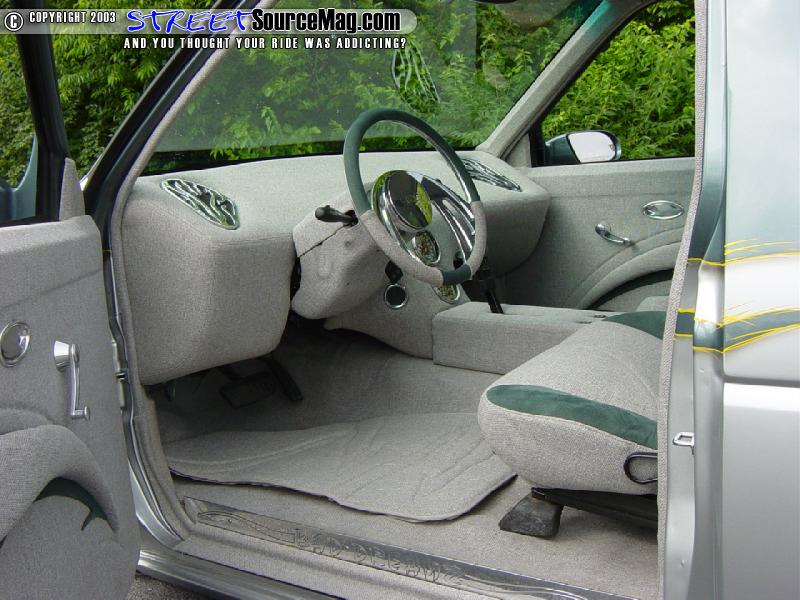 Scott also added an over the rail bed cover to keep the custom gray tweed and green suede, complete with graphics under the cover and throughout the bed panels, out of the weather. Now that the bulk of the work was done and the truck was near completion, it was time to tear into the interior. Not wanting to have the typical cookie cutter Nissan interior wrapped in tweed, Scott decided to use the custom skills of Stitch from Custom Interiors by Stitch to create a one off interior.