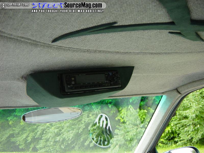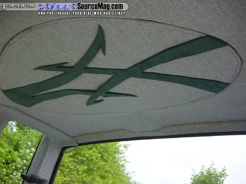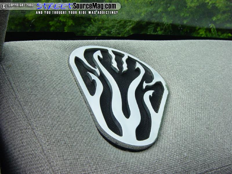 The first thing Stitch had to do was to build a custom dash. Loosing all the heat and air controls and vents cleaned up plenty of room to make a deep slope to the new dash. The CD player was moved to the headliner in a custom mount.   All of the factory gauges were also scrapped in favor of a couple custom painted and relabeled gauges from Classic Instruments. The gauges have the same graphics as the frame.
