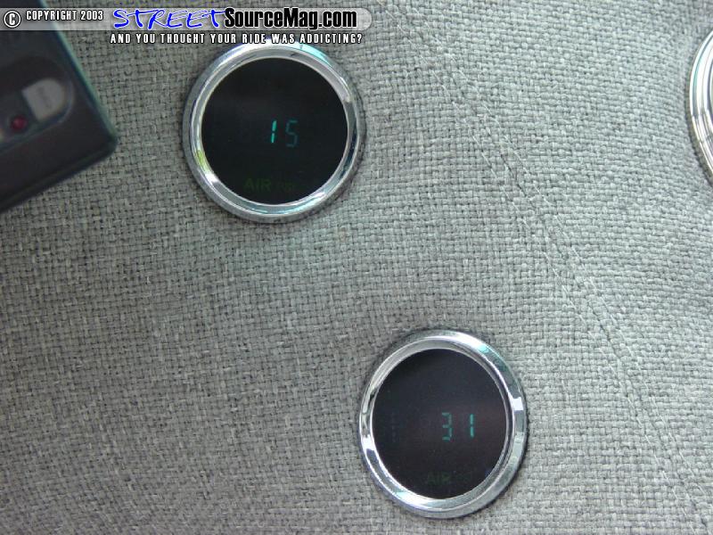 Digital air gauges were also mounted in the new dash. Speaker holes were cut into the dash for the 5.25" speakers on either corner then a pair of custom billet speaker grills were cut out and placed over the speakers.   While the speaker grills were being made, a custom cut billet armrest was also constructed. To continue the billet through out the truck, Scott added a Billet Specialties steering wheel and rear view mirror.