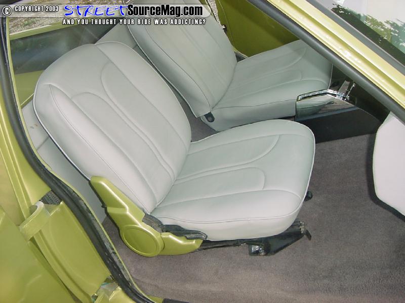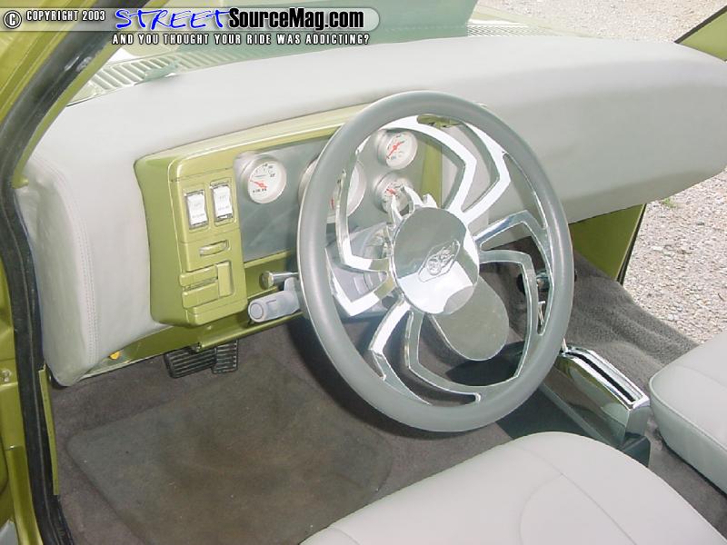 As for the door panels Rusty smoothed them and had Kyle Jones paint them and all the other plastic interior pieces with the same Sublime Green to match the exterior.  The chopped blazer seats where rapped by Roy's upholstery and fit into place. To finish up the interior Rusty added a B.A.D. steering wheel and a B&M floor shifter.