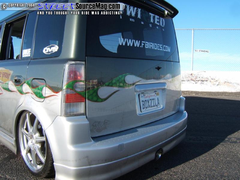 From there, it’s was time for the little box that could to get a face lift. First Phil started with some custom tricks like shaving the rear side markers lights and relocated the exhaust cutout to the middle of the rear bumper. Once that was done, he bolted on a set of Trenz framed perimeter billet grills, bumper grills, and hooking up a carbon fiber hood then it was off for paint. Most people would just hit up their local paint shop to clean their ride up, not Phil, he took his ride to James Cashman of Cashman Customs in Concord, Ca. who is responsible for all the graphics on the Scion.