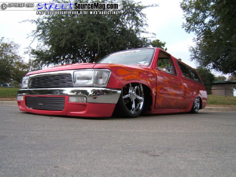 When Brent had completed the stance of the truck, it was then his duty to freshen up the exterior of the truck. He equipped it with a 4Runner front end consisting of grill, front bumper & valance, hood, and fenders. Then came out the welder, and Brent shaved the door handles, hood squirters, wiper cowl, mirrors, gas door, tailgate, and taillights.