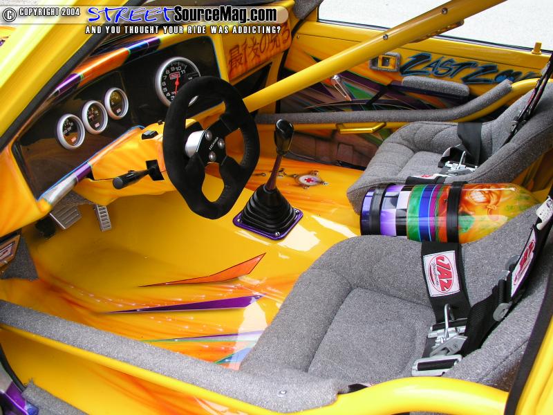 The interior was finished with a handbuilt rollcage. The flooring, dash, and all interior panels were finished up with molded carbon fiber panels. Notice the clean floor mods done for the bodydrop. The entire underside was skinned in aluminum that was later painted to match the exterior graphics.