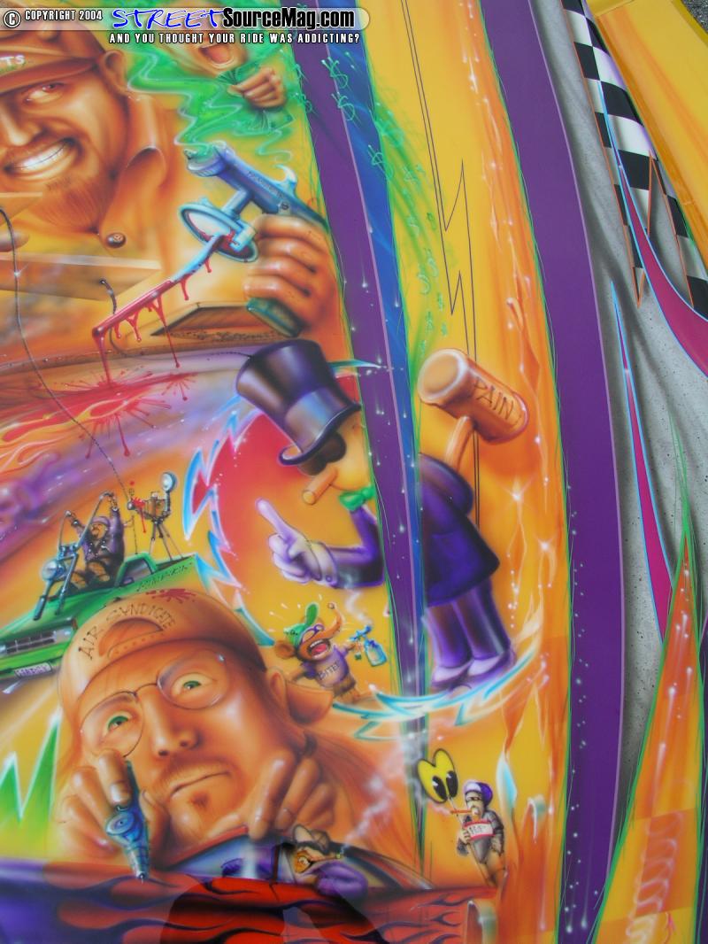 Of course what is a kustom without a mural. Murals in the mid 90's were slowly relegating themselves more to lowriders. The Last Look brought the mural back into consideration on minis. Still not a standard, when done right, murals always increase the interest factor of any kustom. Especially when they tell a story. This hood told the story of the truck, and Kal Koncepts throughout the early 90's. To put it simply,...a lot of people loved the hood,...and a select few didn't. Perhaps because they were on it!, Hey, they are kustom painters,..not role models. When I talked to Dion and told him that SSM had shot Last Look for a feature I could tell he was just as proud today of his creation as he was 10 years ago when he tore the truck scene a new one with a truck that still hold the mini truck scene to a standard few have since reached.