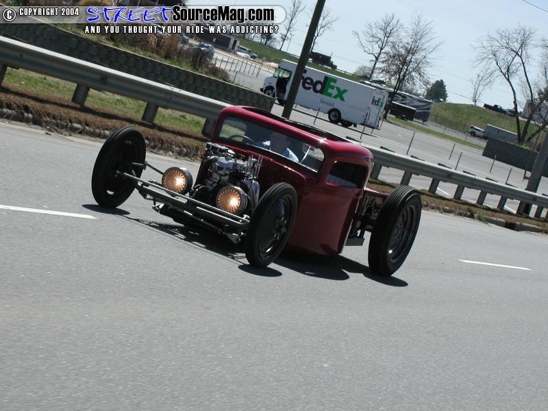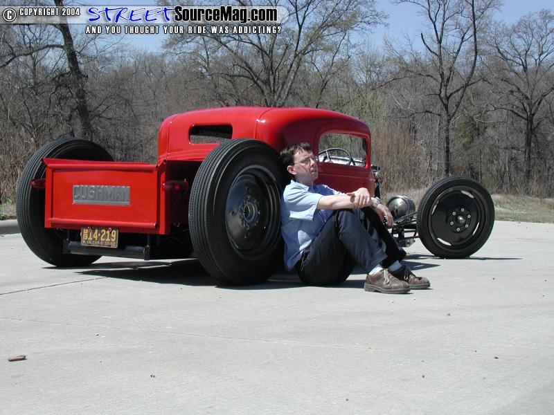 So as it came to a close and winter was slowly fading the guys headed to the paint booth for a few good coats of gloss black for the chassis and International Harvester Red for the body. Yes that is all straight enamel paint for that smooth finish that lies on there. Final assembly began and things that had become mock up went back on for the last time. The lights were off a model T aftermarket deal with aftermarket bubble lenses. The taillights are actually Dazey brand 1960’s ice crushers cut down. The steering was a Corvair box that Jeff built all of the linkage and so forth for to steer him in the right direction. As for a wheel to hold to while starring at that European EBAY dash he stole a wheel from one of his 1968 John Deere lawn mowers. The seats were built from wood and covered by a co-worker of Jeff’s.