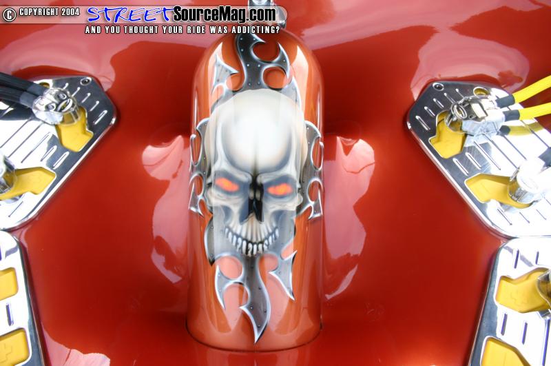 The interior of Bobby’s truck was all smoothed and glassed. The interior also features HOK painted parts with custom graphics. Bobby’s interior features everything from a custom stereo, chrome fire extinguishers, billet steering wheel, to custom wrapped seats.