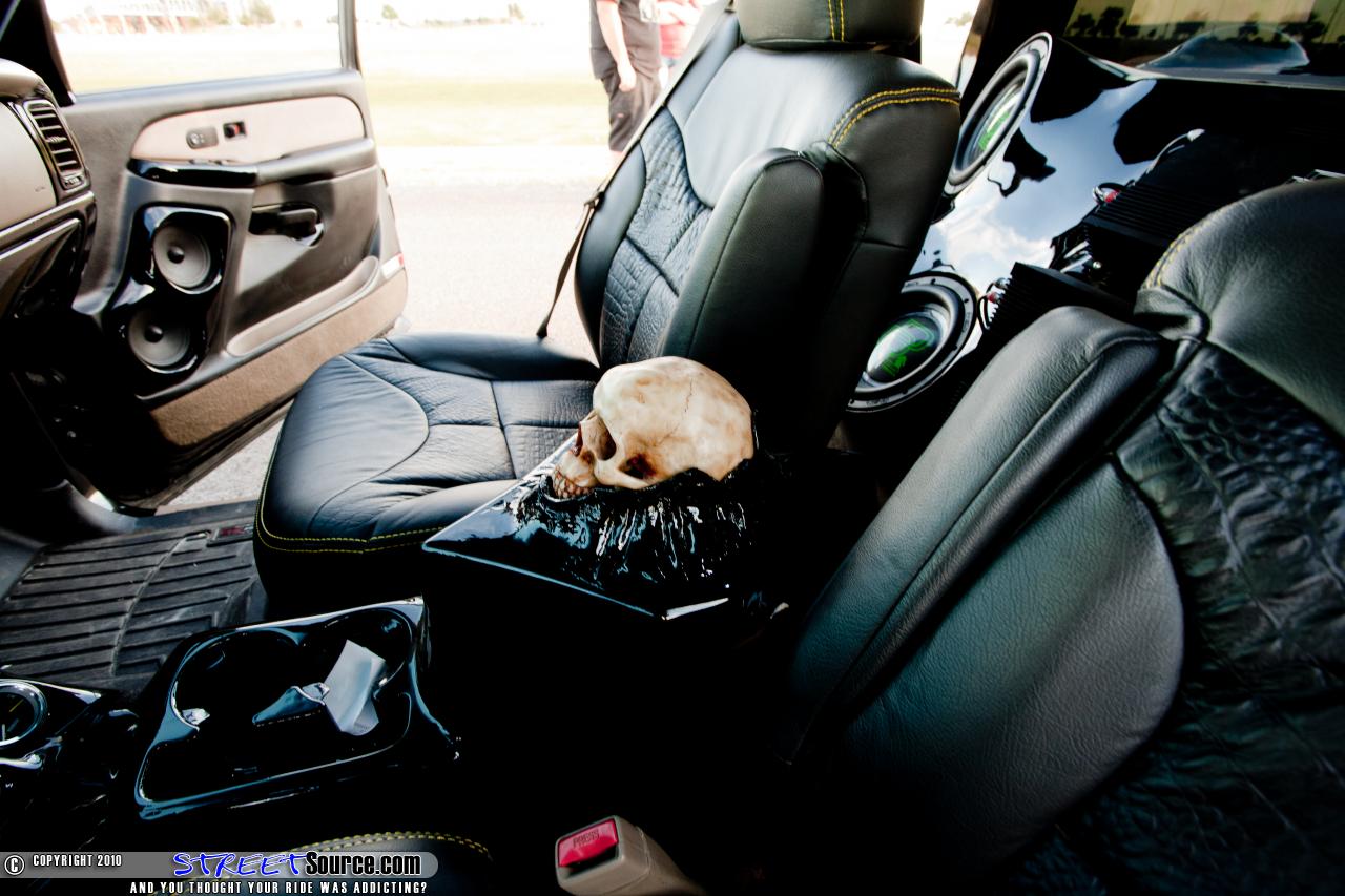 Adam Lovette is no stranger to custom vehicles. Just in the past couple of years, he’s body dropped a 2002 Ford Ranger on twenty twos, and body dropped a Nissan Hardbody that he also stuffed a small block Chevy into it. Getting off on the right foot with his 2001 Chevrolet Sierra, the truck first started off its short four month journey to where it is now by making the 300 mile journey to The Hackshack in Dallas, Texas where their task was to get the truck a little closer to mother earth. While the truck was there, it received a four link out back with Slam Specialties bags on the bar and Fox shocks to keep it nice and smooth. The Hackshack then proceeded to narrow the rear end a total of 6 inches to lay out on the 24x10 inch wheels that they had lined up for it. The last part of the rear was a custom made fuel cell that is located behind the rear axle above the frame rails, so there are no accidental fires or any tragic accidents of that sort. The front end of the truck got the same quality parts and attention as the rear. The front has a set of three inch drop spindles, raised and narrowed upper control arms with Slam Specialties air bags and