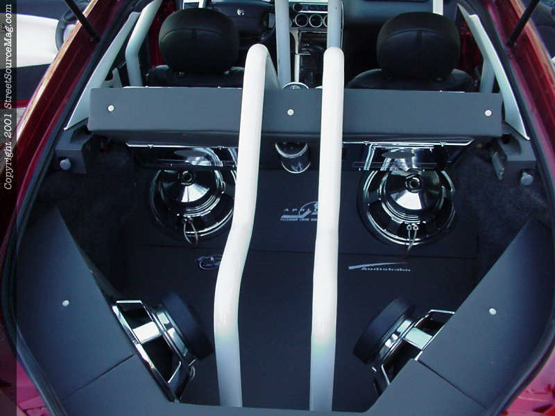 To accompany the custom interior now at hand, Darron took it upon himself to install a bad ass stereo to tie the entire interior together. Starting with an in-dash Pioneer Premier head-unit along with a Cadence EQ,, the tunes would be provided throughout. Next, Darron built his amp rack, which houses three chrome Audiobahn 2600 2-channel amplifiers and 1 chrome Audiobahn 2400 2-channel amplifier. Not only housing the amplifiers, the rack also displays the chrome Audiobahn Acap1 farad caps.