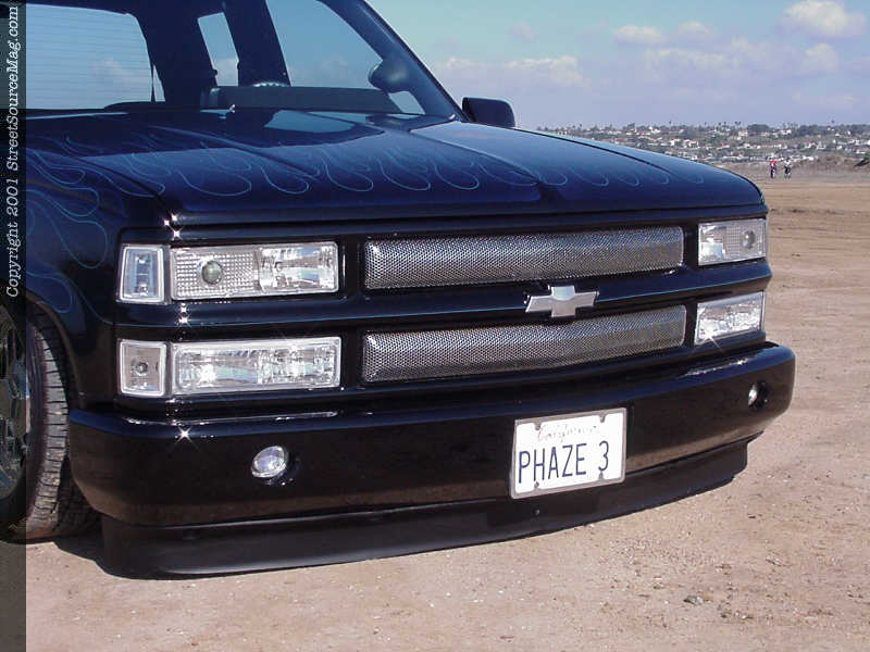 Now finding the Silverado laying flat, it was time to change up the look of the body. Starting with the front, Soupy replaced the grille with a '95 grille fixed with an A&Z mesh insert. The stock headlights were ditched and replaced with APC projector lamps and a CATZ zeta system. Working his way to the rear would take some skilled work, which was left up to Larry "Bones" Llmas of Goleta, California. To start off his work at hand, Larry began by bolting up a custom front bumper from Sir Michaels. Next, Larry filled all the seams behind the cab.