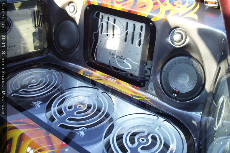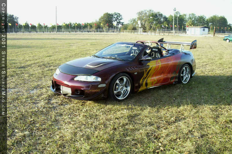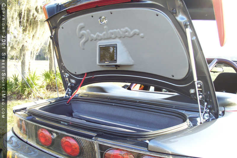 The once empty glove box was motorized and a Sony PS2 game system was added. Moving to what once used to be the rear seating area Gary used Phoenix Gold amps to power the three 10" JL Audio subs and the Diamond Audio highs that were used in the front and the rear of the topless racer. To make sure Gary's prize possession stayed put once it was parked he had an Alpine alarm added. Well whoever said the first time is a charm must have known all about Gary's Spyder. I guess I forgot to mention that Gary is not your normal teenage racer; you see during the two-year process of the car being built, Gary turned 50 years young. And by the way this isn't a trailer queen either, Gary's wife says he drives the car at least 3 times a week. Boy is he brave. Gary would like to thank Autopro for all the hard, long hours of perfection, his sister Kathy, JR Electronics and the most important person in his life, his wife Audrey. I guess when you invest six figures in an Eclipse Spyder you leave the other guys "In The Shadows".