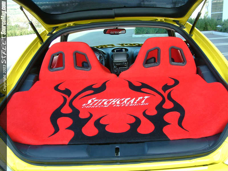 With having the exterior complete and the 19-inch Konig's bolted up, it was time to lower the Mitsu. John would pull out the wrenches and jack in order to pull out the stock suspension and install the 1.8" Progress springs, bringing the car down to an aggressive stance and decreasing the wheel well gap. Along with the new springs, a set of Suspension Techniques anti-sway bar along with a chromed upper front strut bar would be bolted up to give that aggressive stance meaning through the corners. One last thing installed would be a set of AEM front and rear disk brakes to help the quick stops. | With an already aggressive look among it, this Eclipse was equipped with more then it appears | It was now time for John to hit up the crew at Stitchcraft Interiors to help out with his interior needs. While in their hands the doors would be wrapped in Sparco material along with the rear hatch cover.