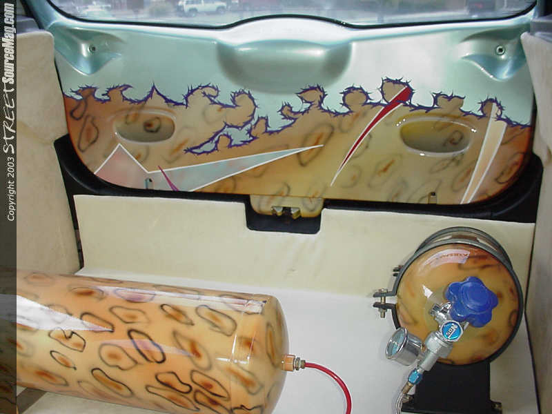 The seats were first re-stitched, complete withcheetah accents. The floor and kick panels were thenrewrapped using tan and cream suede. The rear hatchalso received a makeover, as the panels were wrapped in matching tan and cream suede.  The dash panels were also color matched to the outside of the car, receiving paint and graphics. One can also find billet window cranks.
