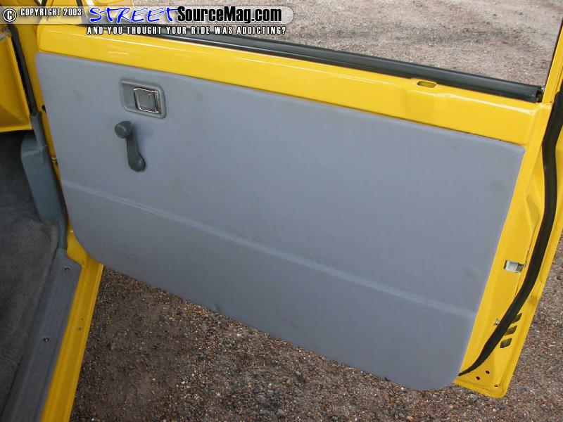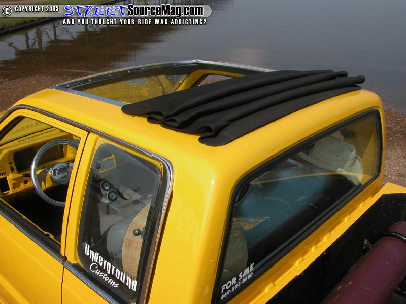 Continuing the work from the exterior, Daniel turned his attention to the interior of the truck. First, he installed a custom black sliding ragtop for the days he likes to feel the wind in his air.   Then, he carried the Chrome Yellow paint inside and slathered the dash and accent pieces to match. He swapped the stock seat material for gray vinyl and suede and also smoothed and covered the new door panels to match.