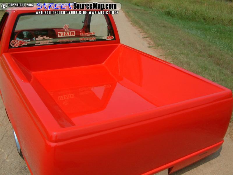 The gas filler door would also be shaved and relocated into the bed, which had been completely sheet metaled, molded and smoothed to perfection. Finishing off the body mods, the tailgate and roll pan in the rear would be molded to the bed while the wiper cowl and antenna would be shaved. Insane Designs and Kreative Colors of Texas would redo a lot of the bodywork.