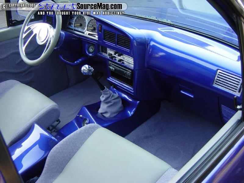 Now that the outside was something that would catch everyone's eye, it was time to completely redo the interior. The factory seat was taken out in favor of some out of a Honda Prelude, but not before they were reshaped and rewrapped in lilac tweed and gray all ante.   Bubba even had the Pebble Pusher logo stitched into the headrest. The door panels were shaved of all extrusions (arm rests, window cranks, door handles) to smooth it out.