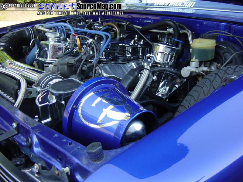 The motor for the Toyota is pretty much stock with the addition of a little chrome and paint here and there to make it match the rest of the truck. A custom 2.5" exhaust was made and a polished intake was added for a little extra power and sound.