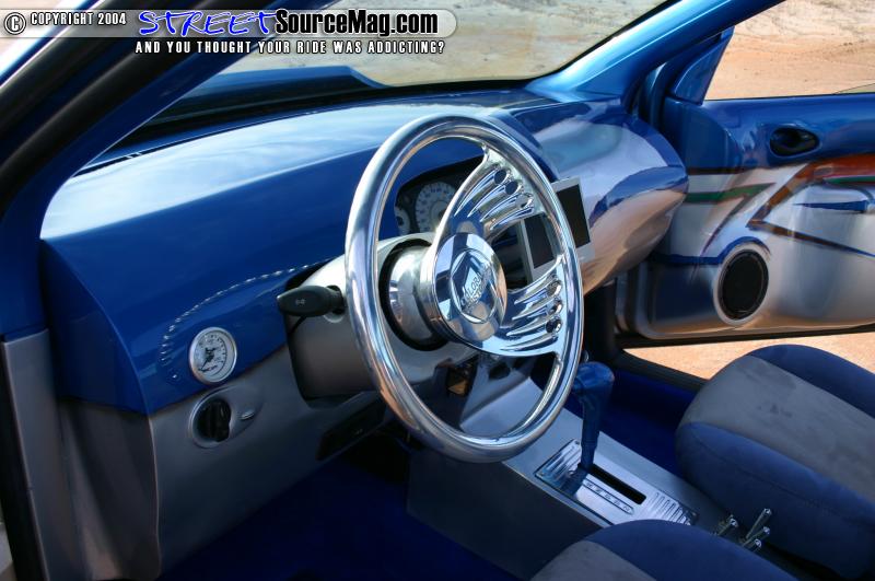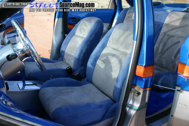 The seats and headliner are wrapped in Miami Suede with the seats being covered in blue and silver and the headliner being wrapped in blue. The suede was laid down by Gary’s Auto Trim in Georgia. The door panels and a panel on the trunk where glassed and then graphed out. Focus Central AC billet knobs set the dash off.