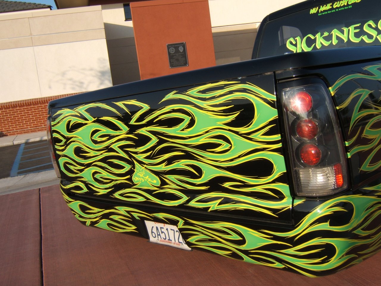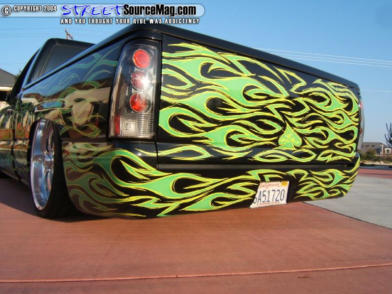 The first thing that draws your attention is the awesome tribal flame paint job that covers every inch of the exterior. All using House of Kolor paints, Kyle from world famous K-Daddyz Kustoms in Bakersfield, Ca., takes the honors for this marvelous piece of rolling machinery.   With pride, he leaves his signature on the tailgate of the truck which just completes the custom job.