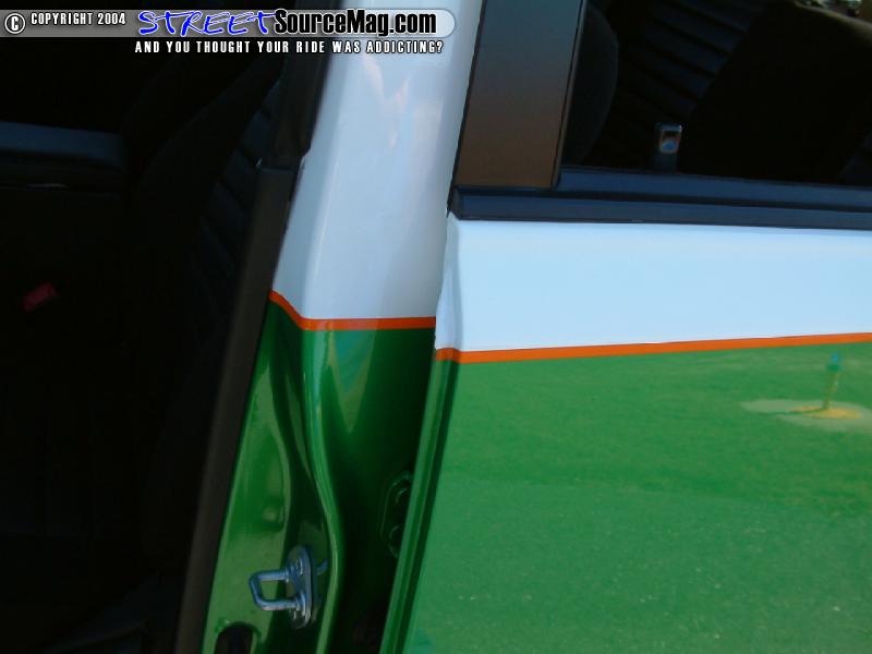With the Scion ready to paint Mike would have the entire body in and out color changed into a two-tone paint scheme. The paint of choice would be a PPG base white and wrangler green. Breaking up the two-tone would be a custom orange pinstripe.Old Dixie Paint and Body out of Vero Beach, FL would be responsible for the bodywork and paint.