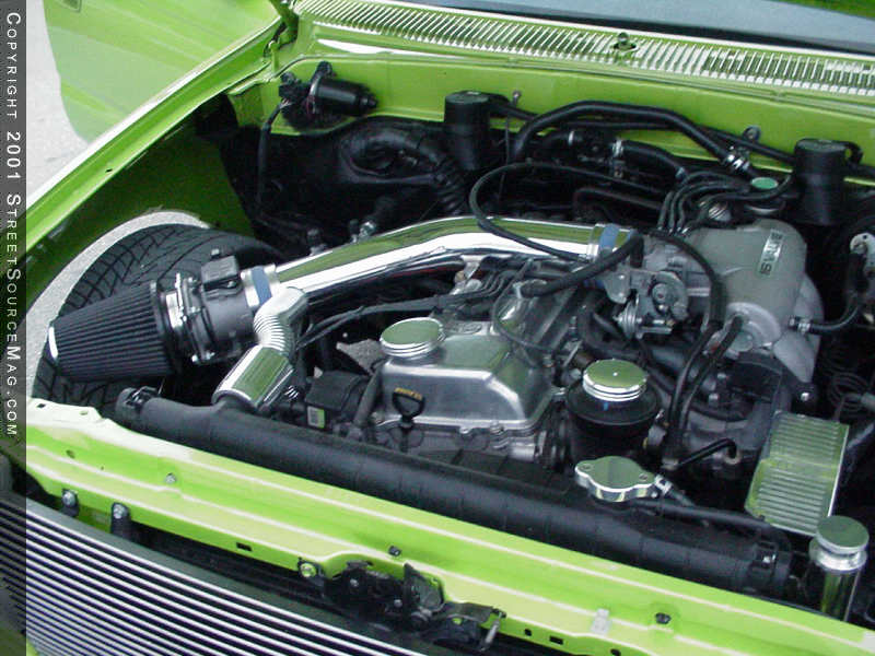 Since Jason drives his beauty to shows, it was a must to install something to listen to on the long hauls to shows. Jason called the guys at N2 Audio for help with this matter. Starting with the head-unit, a JVC Kameleon CD player was mounted in the dash. In the doors, Diamond Audio mids and tweets were installed, and Kicker Solobaric SQ. 8 subs were installed for the boom. Kicker amps power the whole system. Under the hood Jason's factory four-cylinder engine is complimented by a polish Sportruck Specialties air intake system with K&N air filter. Jason also installed Cool Flex polished hoses and several billet cap accessories. To clean up the engine compartment, the battery was removed and moved under the truck on the passenger's side.
