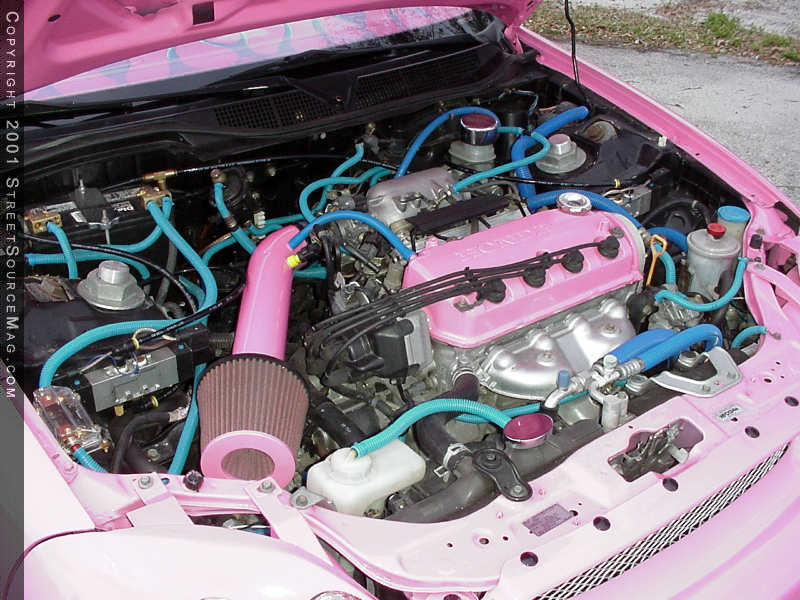 Starting in the dash, Slammin' installed a Pioneer 9000 headunit and then installed JL Audio 5.25's in the doors. A JL Audio 15-W3 sub resides in the rear and Crossfire 1000D and Crossfire 50.4 amps drive the entire system. Since Karen's Civic is more "show" than "go," only a few minor changed occurred under the hood, but were made specifically for winning shows. You'll find a highly detailed stock engine, complete with painted to match parts such as the valve cover and intake, which were both painted pink.
