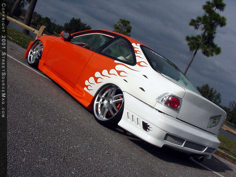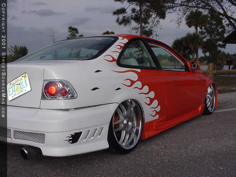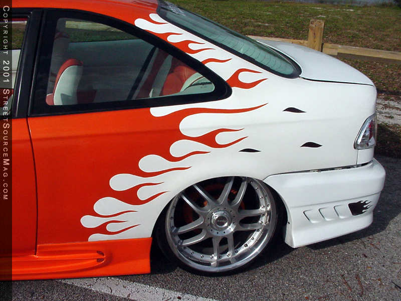 The crew at Fitzpatrick's also shaved the door handles and smoothed the front fenders and hood. In the front of Nathan's Civic you'll also find a Wings West bumper and custom headlights as well as a rear bumper from Wings West.   After the final sanding and prep work was complete, Fitzpatrick's sprayed the car white, then added a truly one-off House Of Kolor Tangelo Orange Pearl across the front of Nathan's Civic, which breaks into a flame-style graphic, separating the two colors.