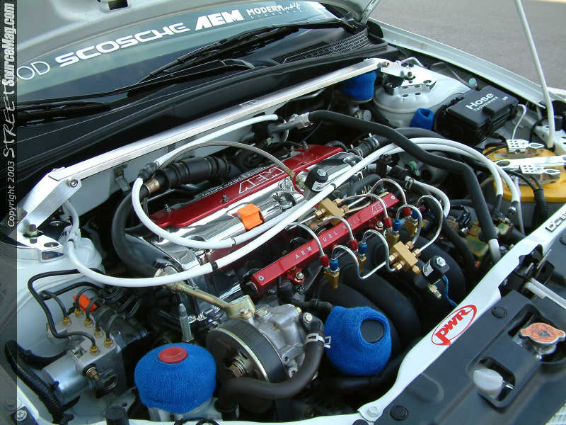 With the already quick 2.0L K20A implant it wouldn't take much to make things quicker and grab attention through not only the streets but at the show scene. For beginners Darron would install an AEM fuel rail, spark plug cover and a AEM cold air intake. Next a DC Sports 4 to 1 header would be bolted up to the block and the 2.25 Magnaflow stainless cat back system to help the engine breath a little easier.