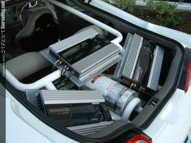 Last but not least would be the Monkey Bars 6-point custom-built roll cage. This cage goes through out the interior confines into the rear hatch where it also holds 2 Kenwood 2-channel amplifiers and one 4-channel amplifier. The amplifiers would help run the Kenwood 6.5 components along with the two Kenwood 10 inch subs cleanly mounted in the rear. Providing the noise would be the in dash Kenwood 7" DVD/TV/CD player.  A special thanks goes out to Darron's fellow club members of Kontradictions for all of their help and support through out the build up.