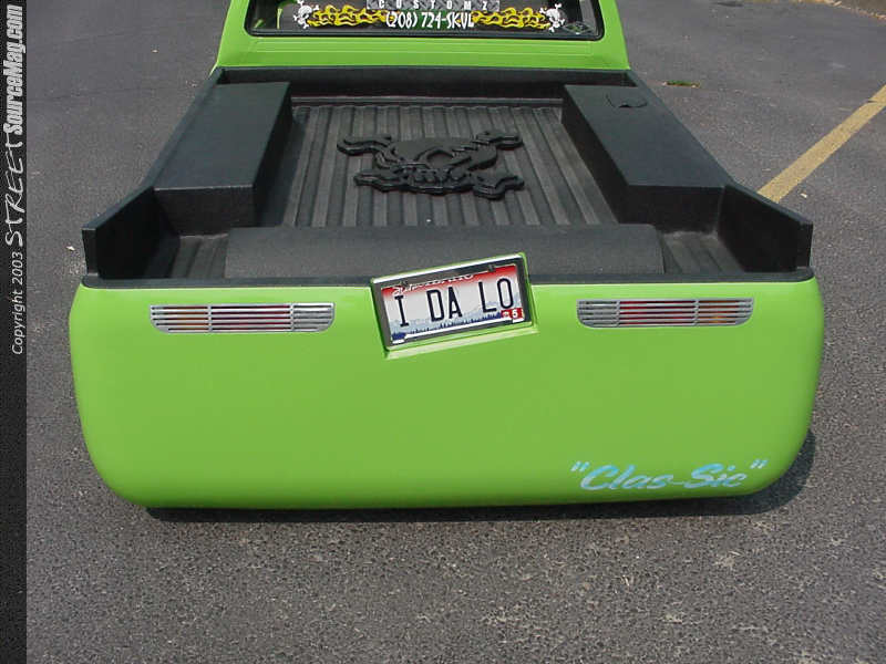 Next, Tony would weld up a Grant Fab tailgate skin housing a frenched in license plate box, once again keeping things smooth. The taillights were removed and replaced by a custom set fabricated by Bob Grant of Grant Fab. Tony from Pirate Customz would be responsible for the bodywork while Matt Stearns would show his block sanding skills.  With every thing ready for paint, it was time to let "Airbrush Chris" of Air Creations, Boise ID, show some skills of his own. The paint of choice for Tony would be a PPG Get'em green with Electric green 2 tone 50's style paint.