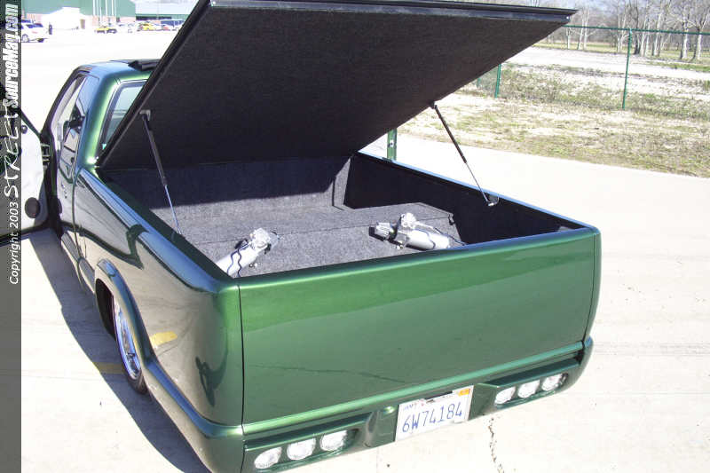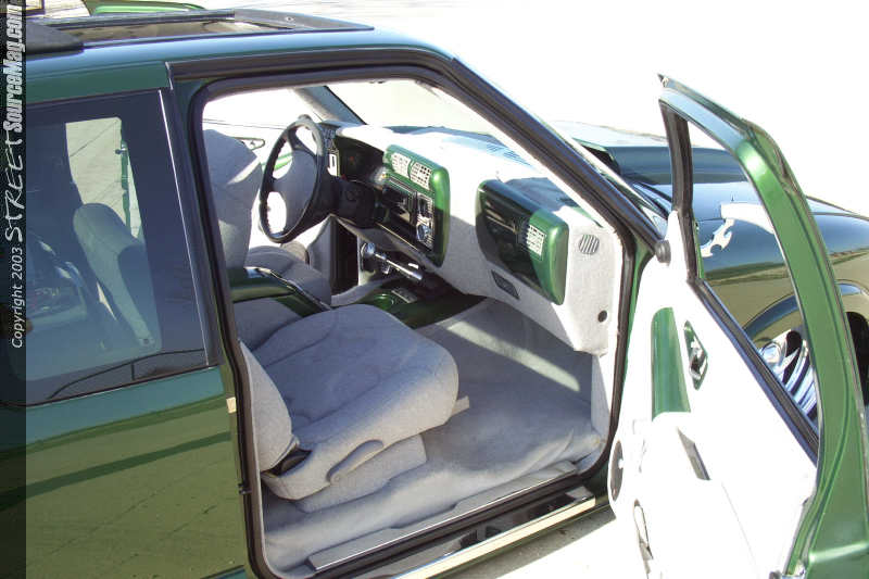 First the door handles, stock mirrors, tailgate handle, taillights and antenna would have to be history. Next the antenna would have be relocated and frenched into the passenger's side of the C pillar. Once all the bodywork was complete Ryan laid down several coats of factory Chevy Fairway Green paint and topped that off with generous amounts of the clear stuff.  With the paint shining it was then time to finish the exterior of the dime. Troy added a 97 Chevy S-10 chrome grill shell with a phantom billet grill hiding the HID conversion headlights neatly behind it.