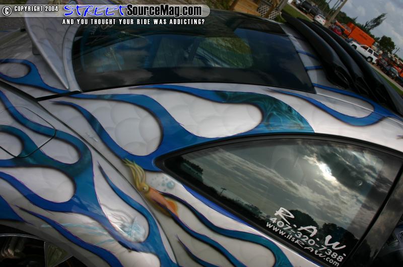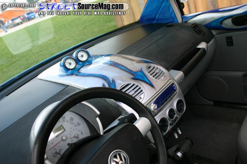 To bring the interior and exterior together with the custom paint and graphics going in through the door jams, Selena would have some fiberglassing work done to some interior panels and the same paint scheme applied within along with a new water feel. The dash piece found over the white faced gauges along with custom door panel pieces would be painted with the same fish scale idea and blue flames followed through to the back-side panels.