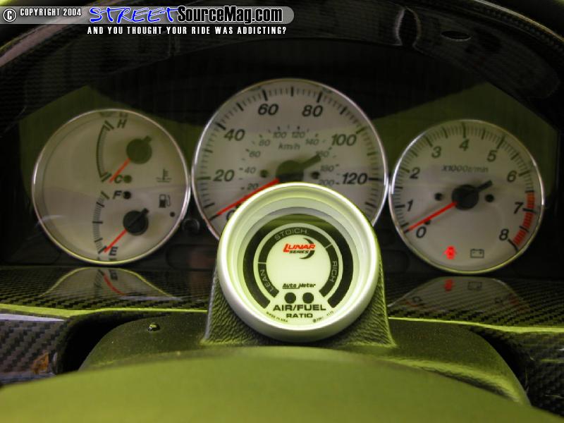 Next Victor turned his wicked grin towards the interior and continued laughing like a mad man. A complete set of Autometer Lunar gauges including a 5" tach with a carbon fiber cup, chrome extinguisher, boost, a/f ratio, exhaust gas temperature, voltage, oil pressure, and NOS pressure were established to monitor the heartbeat of this Protege.