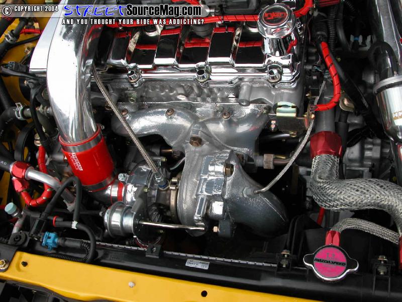 Trick it all up with polished intake pipes, a custom HiBoost turbo manifold polished and ceramic coated by Performance Coatings in Arlington, Texas, steel braided hoses, and an Apex-1 N1 exhaust system. Oh yea, then there's the chrome coolant catch can, the Injen aluminum oil cap, the Top Speed air filter, the MazdaSpeed JDM radiator cap, the chrome strut bar, and the Nokya red engine dress up kit.